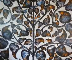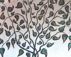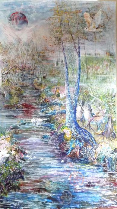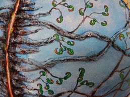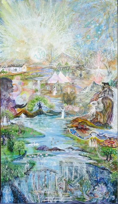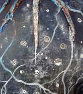 When we look at life from its very beginnings, we see that from the moment life begins, and the cells start to divide, as presented in the painting by the stars and planets amongst the roots of the spinal cord tree. We are all the same, on the first day of life we are a zygote, then we become 2 cells then we divide into 4, 8 then 16 and then 32 cells, where we become a blastocyst, which then forms an embryo, this was the inspired shape for the leaves. It is so interesting to see that a fish, tortoise, chicken, pig, cow, human, and so on are all similar at the embryo stage and no matter what the developmental form turns into, whatever our parents origin, whatever country we are born in we begin the same. If we really grasp this, it should have an effect on how we treat one another, so long as we are not tricked by the judging mind into believing that we are separated. If we fully understood this reality, surely we would not see our neighbours starve or endure suffering from lack of clean water and disease. We would not pollute or carelessly harm and destroy our home, this planet, or continue to ignore the problems our earth faces.