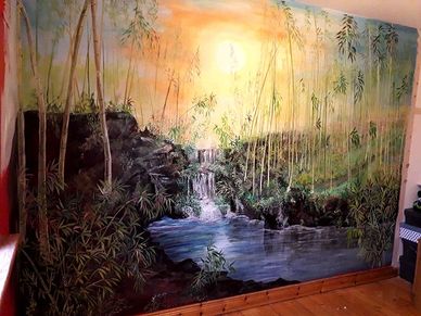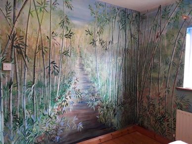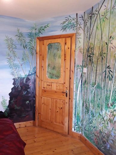 This room was transformed by designing and painting a bamboo forest scene around the whole room.
