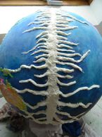 The spine was constructed onto the globe, I felt as if I was building the planets back bone, which stretches across the globe through the ring of fire. I carved and painted an orange ridge into the structure as if looking down into the core.