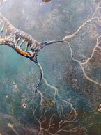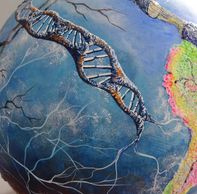 On one side of the globe the universal roots travel upwards and merge into the double helix, DNA structures which interconnect with brain neurons and travel back into the mind at the top of the globe. On the opposite side of the globe, one of these interconnecting neuron trees breaks into a synapse across the borders of the Americas, again trying to establish a mind that sees no separation of people or continents. These neuron trees are represented in tree like structures to further enthersise the interconnectivity of everything. The main branches running off of the spinal cord tree float across the globe in all directions, to once again form the interconnectivity between everything on the planet. Hanging from the branches are the leaves, they represent the natural world of flora and fawner, together with every individual animal and human on the Earth.