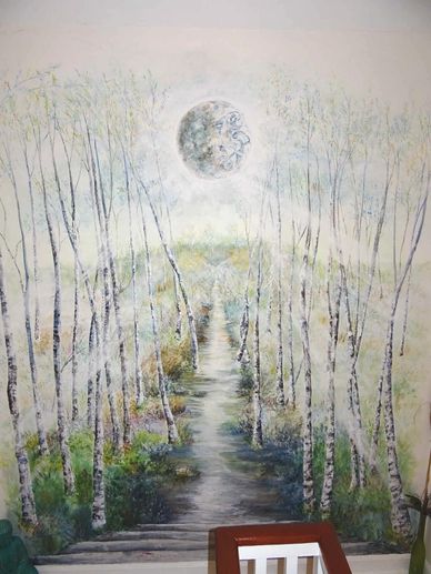 The idea in this room was to create a peaceful space where the art of healing can take place. I formed the painting around a 6 sided star which is an important symbol in the healing world. I used the central mountain to form this star within the landscape and have pulled inspiration from Lapchi in the Hymalayas. This is said to be a triple triangle: the sky above, the earth below, and the rivers between each forming a triangle. The central mountain is seen as the palace of the Bodhisattva Chakrasamvara, three other mountains are said to be the palaces of Avalokiteshvara, Vajrapani, and Manjushri. There are four very hidden sacred valleys in the Himalayas: Lapchi is one.